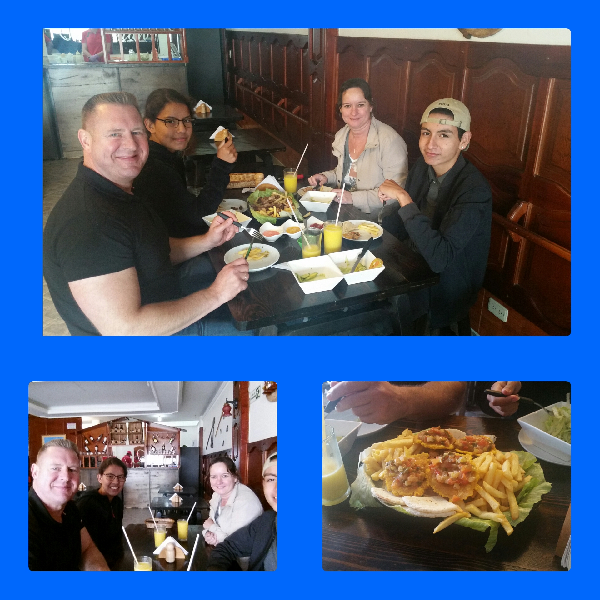 kathedraal te bezichtigen. We zijn in de auto weer wat opgewarmd, maar het knusse restaurantje is van voren helemaal open, dus echt warm is het hier ook niet.Het eten is heerlijk! Een mangosap, waar vooral Danilo helemaal weg van is en vooraf zoute bananenchips met een roze dipsausje. Dan een overheerlijke salade en als hoofdgerecht een grote schaal met stukjes kip- en rundvlees met daarover heen patatjes en gefrituurde pannenkoekjes van geplette bakbananen met een salsa van paprika, tomaat en ui. We eten met z’n vieren uit de schaal en er mag met de handen gegeten worden.
